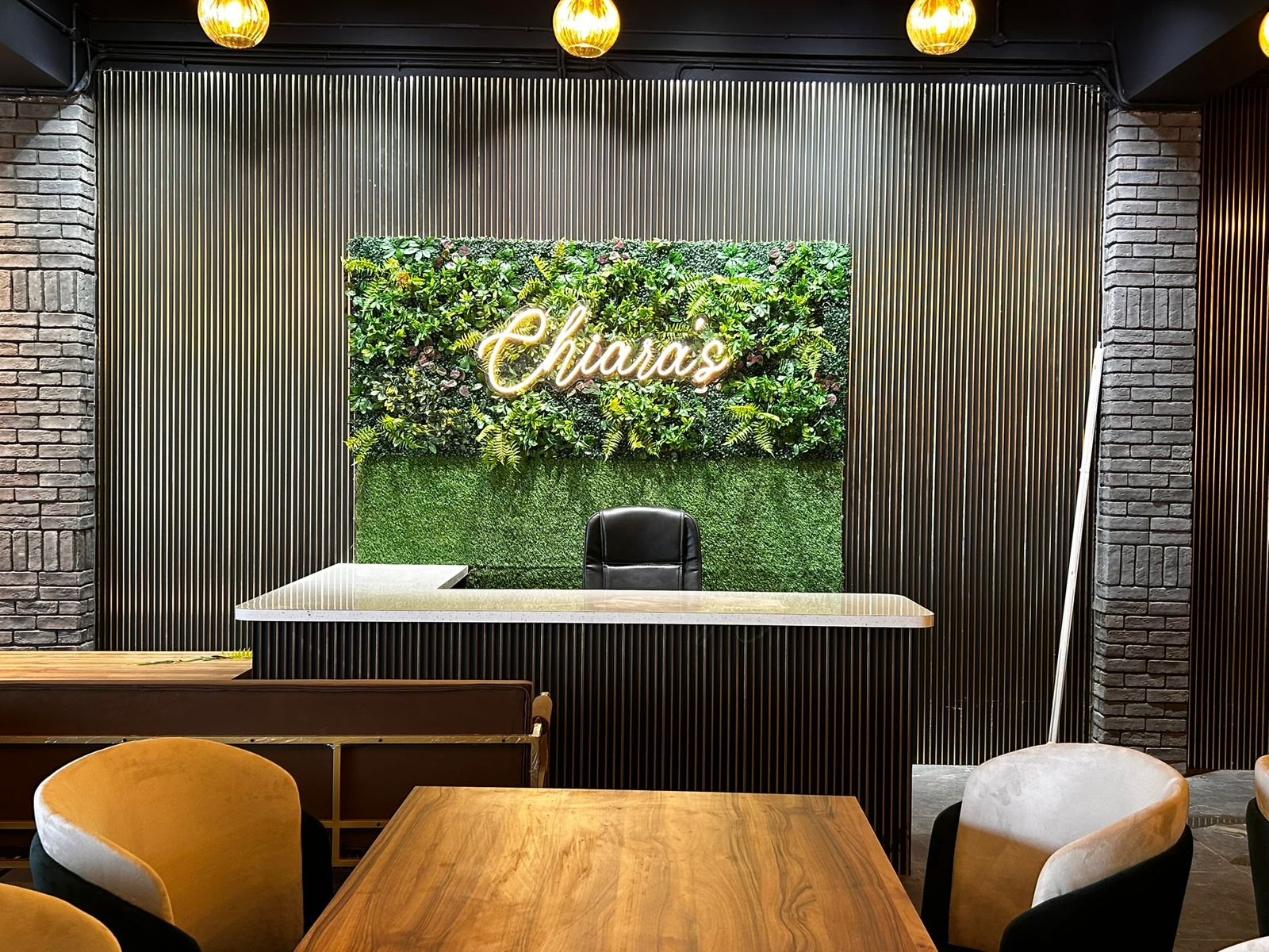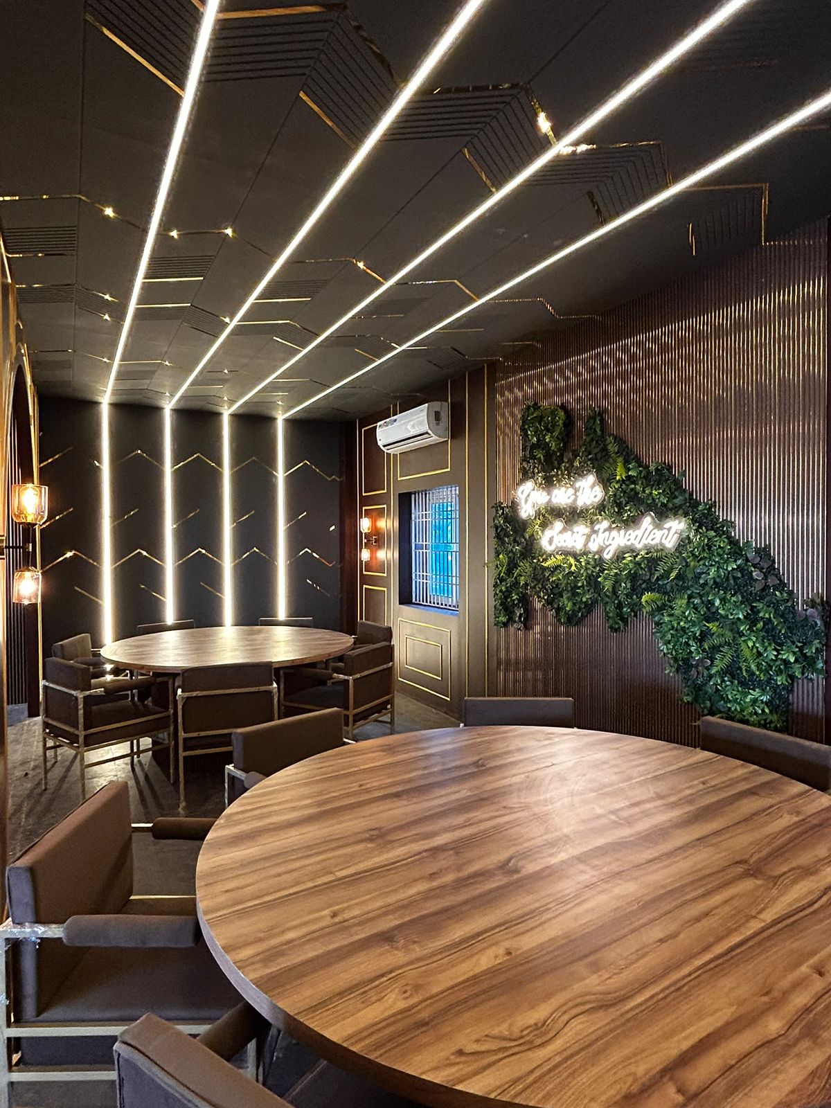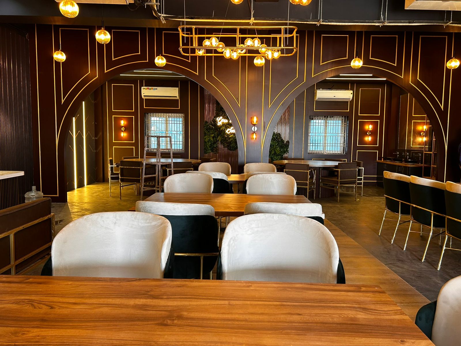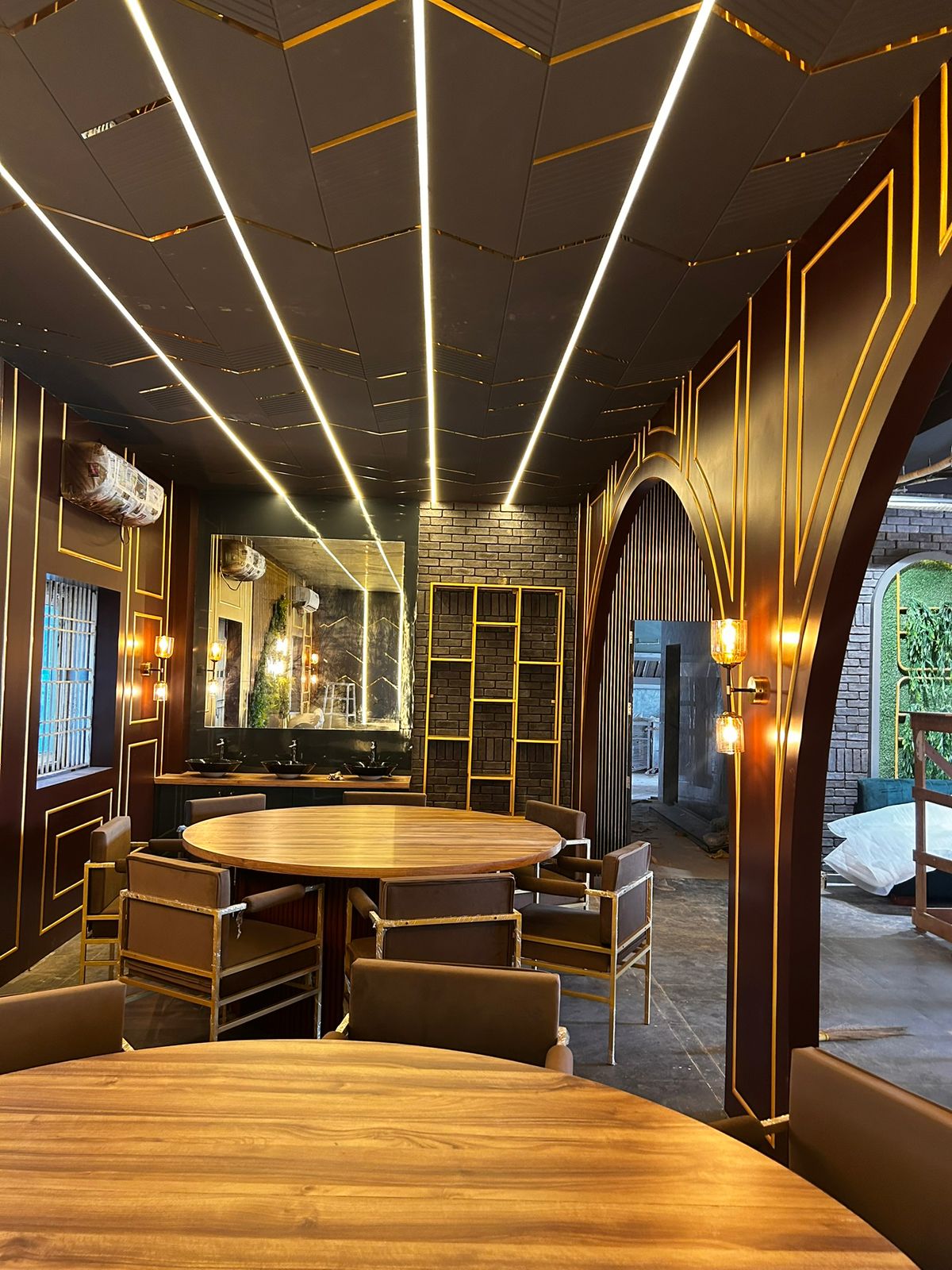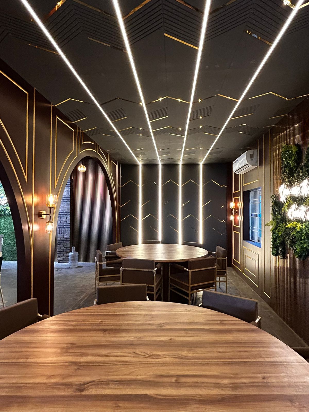 From rich walnut textures and warm gold accents to dramatic arches, geometric ceiling lighting, and lush green walls — every corner of this restaurant is designed to elevate your dining experience.