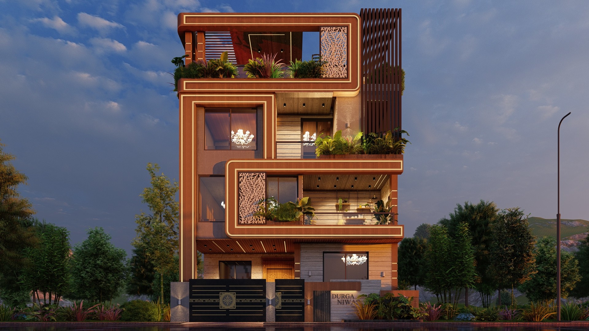 The façade features clean lines, layered balconies, vertical fins, and soft accent lighting to create a strong yet elegant street presence. Integrated planters and open terraces add greenery while enhancing depth and balance in the overall form.