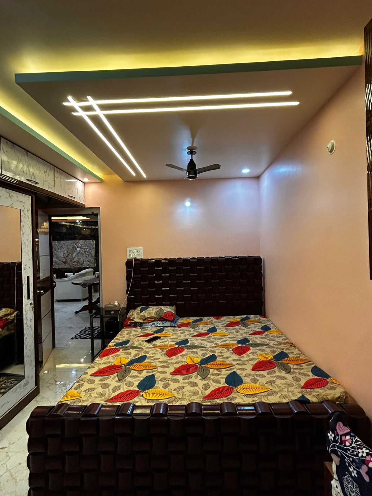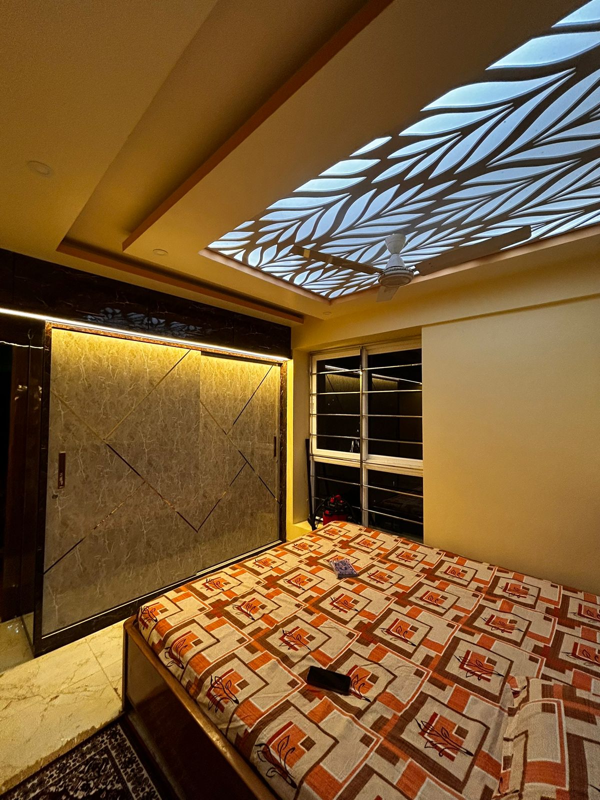 Master Bedroom- Backlit CNC ceiling, marble-finish sliding wardrobe & soothing ambient lighting.