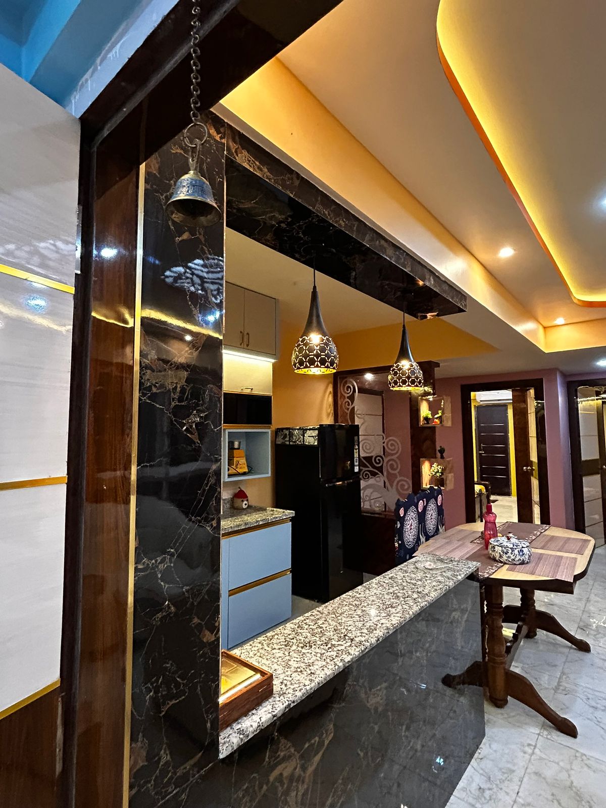 Living,Dining & Kitchen- A seamless flow with a granite breakfast counter, rich textures, and elegant pendant lights.