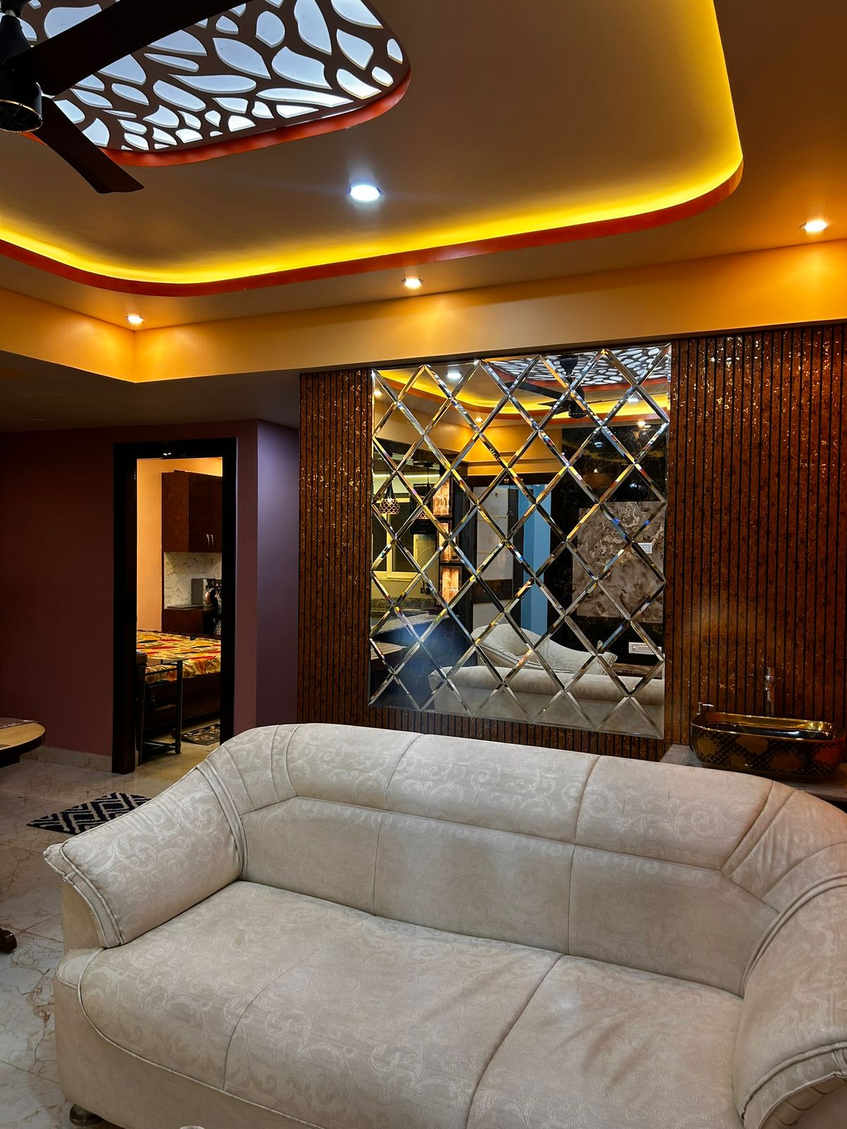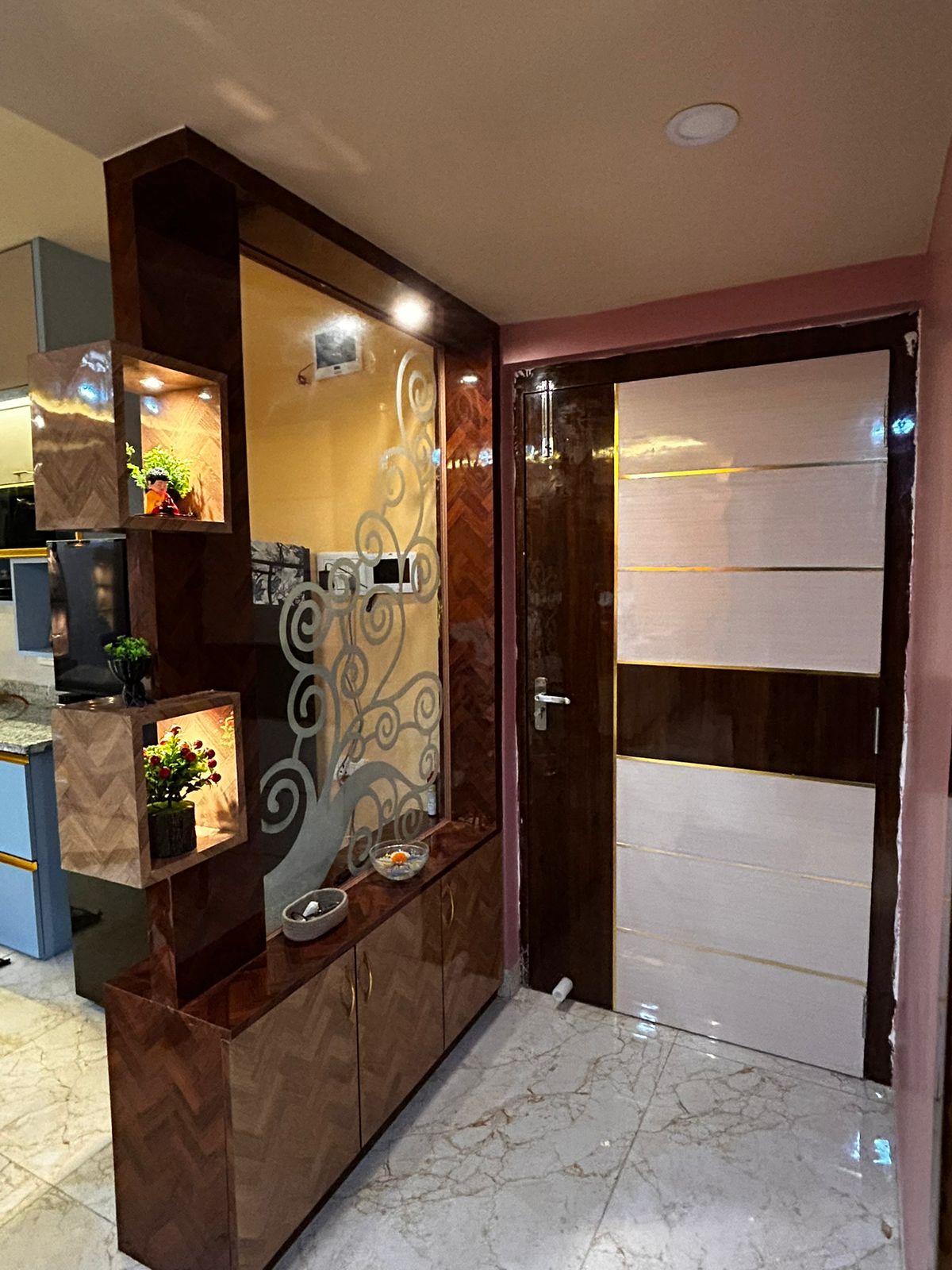 Feature Partition- Frosted swirl panel with lit wooden niches creating a stylish visual highlight.